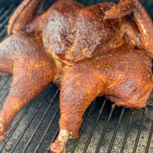 When you reach 165 degrees in the deepest part of the breast and thigh it's time to come off the smoker or oven. Rest for 15 minutes inside lightly tented in foil before carving and serving.